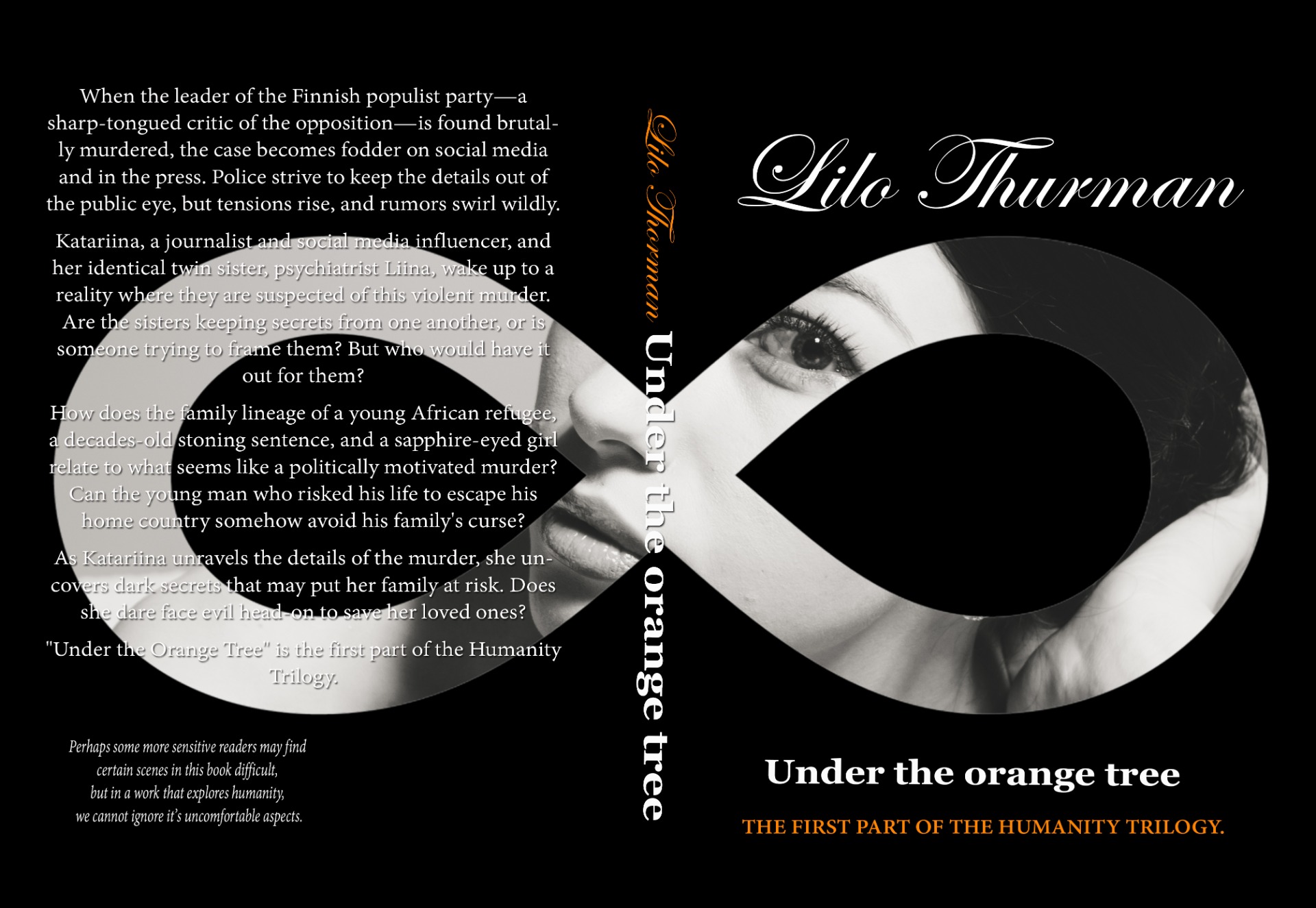 This is the first part of the Humanity Trilogy, titled Under the Orange Tree. It tells the story of a Finnish social media star and journalist, Katariina Heikkilä, who has an identical twin sister, a psychiatrist and eco-anarchist, Liina Heikkilä.